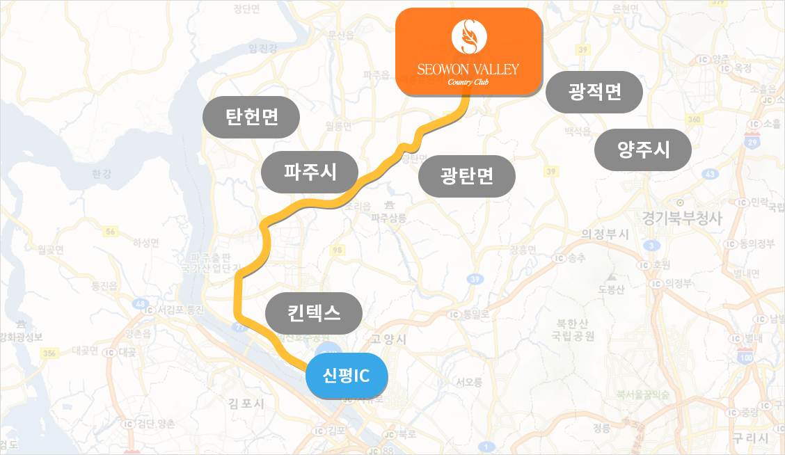 1. 신평IC - 2. 법곳IC 우회전 - 3. 산내교차로 우회전 - 4. 광탄IC 직진 - 5.방축교차로 우회전 - 6.방축2교차로 직진(광적,양주방향) - 7. 서원밸리컨트리클럽 도착