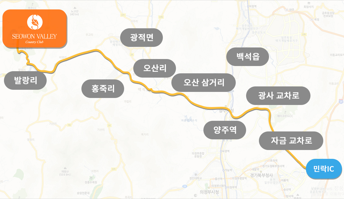 1. 민락IC - 2. 민락교차로- 3. 광사교차로- 4.양주시청 사거리(법원리/백석/광적방향:360번)좌회전 - 5.막은골 삼거리(법원리/백석/광적)직진- 6.오산 삼거리(법원리/광전:360번)우회전 -7. 백석 삼거리(파주/광적:360번 직진) - 8. 가납사거리(파주/장흥:360번)좌회전 - 9. 대성빌라 사거리(파주/연곡리 2시방향도로: 360번)직진 - 10. 석천가든 앞 삼거리(파주/비암리:360번)직진- 11. 서원밸리컨트리클럽 도착